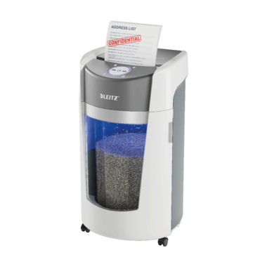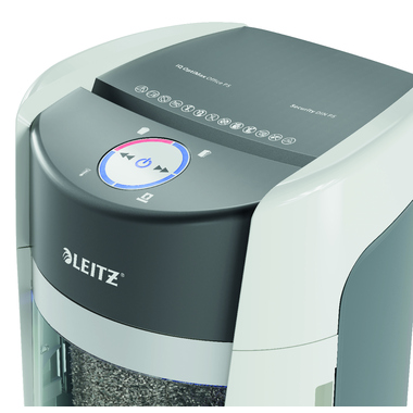 Leitz IQ OptiMax Office Mikroschnitt Aktenvernichter Sicherheitsstufe P5 35 L - Weiß · Der Leitz IQ OptiMax Aktenvernichter bietet eine innovative und elegante Lösung für die Aktenvernichtung und sorgt gleichzeitig für außergewöhnliche Dokumentensicherheit und für ein gutes Gefühl. Dieser hochsichere DIN P5 Aktenvernichter zerkleinert mühelos bis zu 10 Blatt A4 auf einmal in mikrokleine Stücke. Der IQ OptiMax verfügt über die weltweit erste und einzigartige rotierende Behältertechnologie, die die Behälterkapazität effektiv um +33 %* erhöht. Der sich drehende Auffangbehälter sorgt für eine flache und gleichmäßige Verteilung des Papiers und verhindert, dass sich die Papierschnipsel zu einer Spitze auftürmen. So können zusätzlich 140 A4-Blätter zerkleinert werden, bevor er geleert werden muss. Dank der innovativen Rotationstechnologie muss der Behälter nicht entnommen und geschüttelt werden. Die Füllstandsanzeige leuchtet erst, wenn der Behälter wrklich voll und 100 % seiner Kapazität erreicht hat. Der großzügige 35-Liter-Behälter fasst bis zu 550 Blatt A4 und leuchtet während des Betriebs blau. Das intuitive drehbare LED-Display verfügt über rote Warnanzeigen für verschiedene Zustände wie Behälter voll und Tür offen. Der Leitz IQ OptiMax ist dank seines extrem leisen Betriebs, seines schlanken Designs und seiner beeindruckenden Langlebigkeit vielseitig einsetzbar. Dauerbetrieb von 120 Minuten. Farbe: Weiß. *Leitz IQ OptiMax getestet mit und ohne rotierende Behältetechnologie. · Der Leitz IQ OptiMax Aktenvernichter verfügt über die einzigartige rotierende Behältertechnologie, die durch eine gleichmäßige Verteilung der Papierschnipsel die Kapazität des Behälters um +33 % erhöht (140 Blatt A4). Weniger häufige Entleerungen im Vergleich zu keinem herkämmlichen Abfallbehälter ohne Rotation. Sicherer DIN P5 Mikroschnitt-Aktenvernichter. 35-Liter-Behälter für 550 Blatt A4. Zerkleinert bis zu 10x A4-Blätter auf einmal. · Zerkleinert bis zu 10 Blatt A4-Papier (80 g/m²) in nur 10 Sekunden in hochsichere P5-konforme Mikroschnitte. · Die einzigartige rotierende Behältertechnologie maximiert das Fassungsvermögen des Behälters um +33 %* und erleichtert das saubere Entleeren. *Leitz IQ OptiMax getestet mit und ohne rotierende Behältetechnologie. · Der großzügige 35-Liter-Behälter fasst bis zu 550 Blatt A4-Papier, bevor er geleert werden muss; +33 % mehr Kapazität im Vergleich zu einem Behälter ohne Rotationstechnologie (+140 Blatt A4). · Dynamisch drehbares LED-Display mit Anzeigen für vollen Behälter, offene Tür, Überhitzung und Überlast. · Ultraleiser Betrieb - für eine ruhige Arbeitsumgebung (bei regelmäßiger Verwendung von Leitz Ölpapieren) · Zerkleinert Heftklammern und Büroklammern, ohne dass diese vorher entfernt werden müssen. · Kontinuierliche Laufzeit von 2 Stunden / 120 Minuten - vollständige, ununterbrochene Zerkleinerung, ideal für den Einsatz im Büro. · Die Anti-Papierstau-Technologie sorgt dafür, dass der Aktenvernichter automatisch stoppt und das Papier zurückfährt, wenn zu viel Papier eingelegt wurde. · Dank seines runden Designs benötigt der Schredder nicht viel Platz und passt so auch optimal in schmale Räume. · Mit den vier hochwertigen Lenkrollen lässt er sich leicht an verschiedene Orte bewegen. · 2+1 Jahre Garantie - registrieren Sie sich für ein Jahr Garantie extra ·