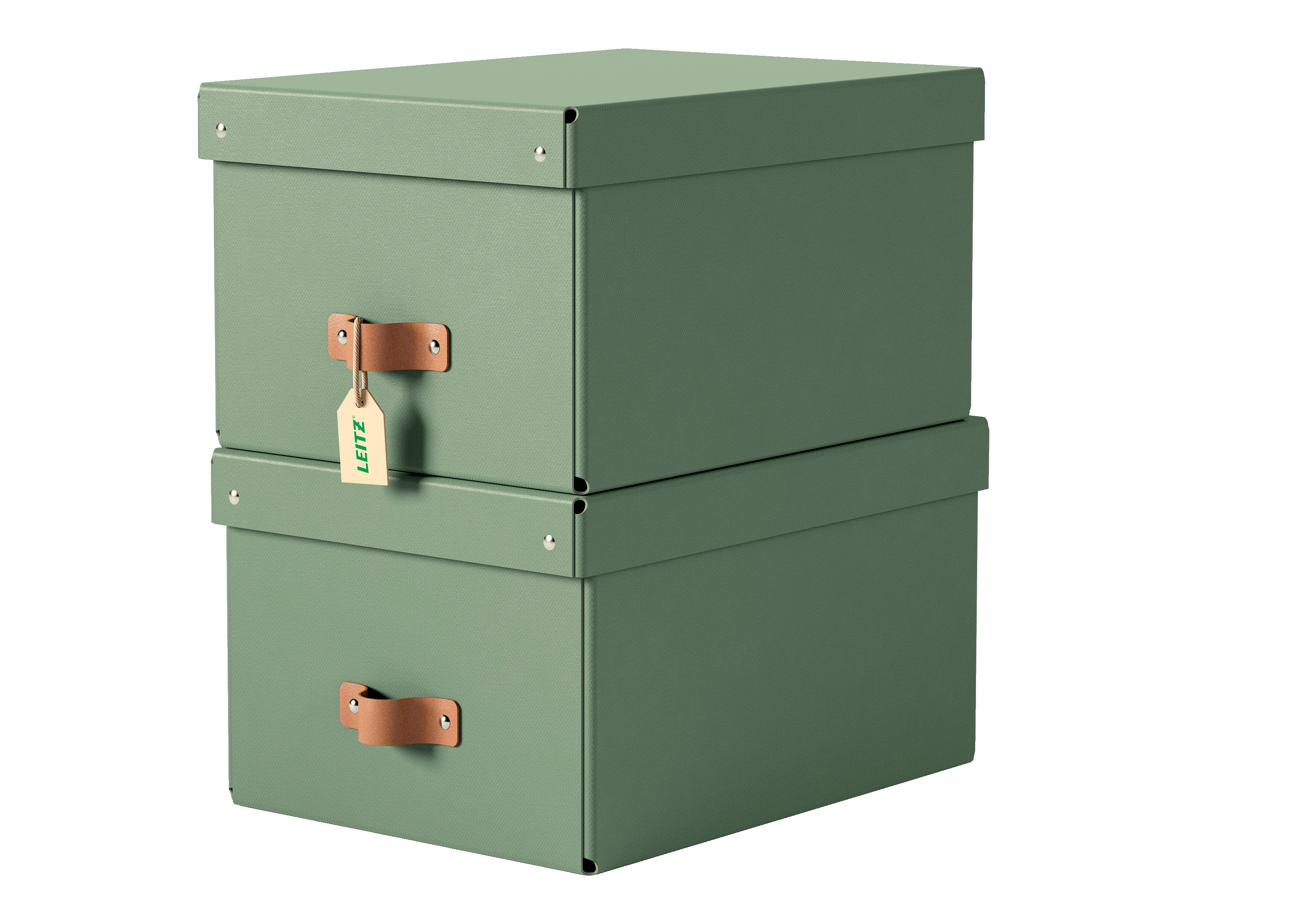 Leitz Puro Aufbewahrungsbox mit Deckel, mittel, 17L, 100% recycelter Karton, 2er-Pack · Ordnung halten und sich wohlfühlen - mit den Leitz Puro mittelgroßen Aufbewahrungsboxen aus Karton mit Deckel schaffen Sie sofortigen Stauraum und befreien Ihre Räume von Unordnung. Dieses Set aus zwei dekorativen Aufbewahrungsboxen mit einem Fassungsvermögen von 17 Litern hilft Ihnen, Ihr Zuhause und Ihr Büro zu organisieren und verleiht Ihrer Aufbewahrung Stil. Diese hochwertigen Boxen lassen sich platzsparend stapeln und sind ideal für die Aufbewahrung von A4-Dokumenten, Laptops, Spielzeug, Schuhen und Bastelmaterial. Die Leitz Boxen werden flach verpackt geliefert und sind schnell und einfach ohne Werkzeug zu montieren. Diese stapelbaren Aufbewahrungsboxen sind zu 100 % aus recyceltem FSC-zertifiziertem Karton hergestellt und können nach Gebrauch zu 100 % recycelt werden. Die Auswahl an erdigen Farben - inspiriert von der Reinheit und Schlichtheit der Natur - passt perfekt zu Ihrer Einrichtung und bringt Ruhe in Ihre Räume und Büros. Jede Leitz Aufbewahrungsbox ist mit einem ledernen Griff ausgestattet, der das einfache Herausnehmen aus Regalen und Schränken ermöglicht. Hergestellt in Italien. Feel Good mit Leitz. · Set aus zwei mittelgroßen Aufbewahrungsboxen aus Karton mit Deckeln. 17L. Leicht zu montierende Aufbewahrungsbox für A4-Dokumente und andere Gegenstände. 100% recycelter Karton. · Set aus zwei mittelgroßen Aufbewahrungsboxen mit Deckel aus 100 % recyceltem FSC-zertifiziertem Karton in modernem und schlichtem Design, das Ihr Zuhause und Büro ergänzt · Vielseitiger Stauraum mit einem Fassungsvermögen von 17 Litern, ideal für A4-Dokumente, 14-Zoll-Laptops, Spielzeug, Hobby- und Bastelzubehör sowie für die Organisation von Accessoires in Ihrem Kleiderschrank, die leicht zugänglich sein müssen · Starkes und haltbares Material ermöglicht sicheres und platzsparendes Stapeln der Boxen während der Aufbewahrung. · Erhältlich in einer Auswahl an ruhigen, erdigen Farben mit matter Oberfläche, die Sie kombinieren können, um einen modernen und organisierten Raum zu schaffen · Dank des eleganten Ledergriffs lassen sich die Aufbewahrungsboxen aus Karton leicht aus Regalen, Schränken, oder Garderoben entnehmen · Passt perfekt in kubische Möbel, auf Ablageflächen, in die meisten Standard-Schubladen und kann als Aufbewahrung unter dem Bett verwendet werden · Wird flach verpackt in einer plastikfreien Verpackung geliefert und lässt sich einfach und ohne Werkzeug montieren · Kann zu 100 % recycelt werden, indem die Aufbewahrungsboxen einfach in einzelne Teile zerlegt werden · Hochwertige stapelbare Aufbewahrungsboxen, Made in Italy · FEEL GOOD mit Leitz ·