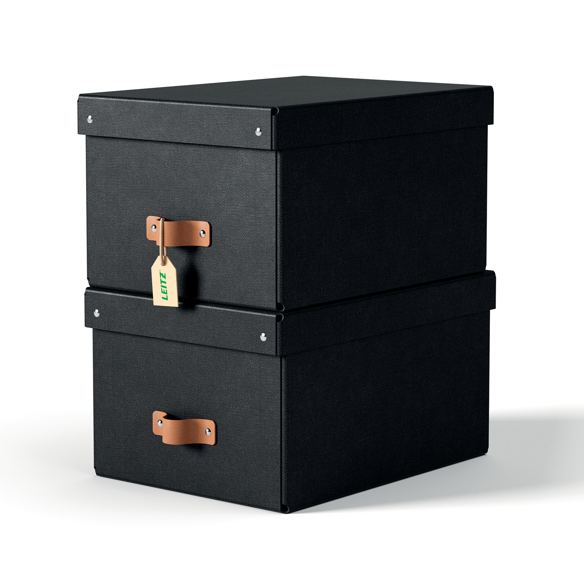 Leitz Puro Aufbewahrungsbox mit Deckel, mittel, 17L, 100% recycelter Karton, 2er-Pack · Ordnung halten und sich wohlfühlen - mit den Leitz Puro mittelgroßen Aufbewahrungsboxen aus Karton mit Deckel schaffen Sie sofortigen Stauraum und befreien Ihre Räume von Unordnung. Dieses Set aus zwei dekorativen Aufbewahrungsboxen mit einem Fassungsvermögen von 17 Litern hilft Ihnen, Ihr Zuhause und Ihr Büro zu organisieren und verleiht Ihrer Aufbewahrung Stil. Diese hochwertigen Boxen lassen sich platzsparend stapeln und sind ideal für die Aufbewahrung von A4-Dokumenten, Laptops, Spielzeug, Schuhen und Bastelmaterial. Die Leitz Boxen werden flach verpackt geliefert und sind schnell und einfach ohne Werkzeug zu montieren. Diese stapelbaren Aufbewahrungsboxen sind zu 100 % aus recyceltem FSC-zertifiziertem Karton hergestellt und können nach Gebrauch zu 100 % recycelt werden. Die Auswahl an erdigen Farben - inspiriert von der Reinheit und Schlichtheit der Natur - passt perfekt zu Ihrer Einrichtung und bringt Ruhe in Ihre Räume und Büros. Jede Leitz Aufbewahrungsbox ist mit einem ledernen Griff ausgestattet, der das einfache Herausnehmen aus Regalen und Schränken ermöglicht. Hergestellt in Italien. Feel Good mit Leitz. · Set aus zwei mittelgroßen Aufbewahrungsboxen aus Karton mit Deckeln. 17L. Leicht zu montierende Aufbewahrungsbox für A4-Dokumente und andere Gegenstände. 100% recycelter Karton. · Set aus zwei mittelgroßen Aufbewahrungsboxen mit Deckel aus 100 % recyceltem FSC-zertifiziertem Karton in modernem und schlichtem Design, das Ihr Zuhause und Büro ergänzt · Vielseitiger Stauraum mit einem Fassungsvermögen von 17 Litern, ideal für A4-Dokumente, 14-Zoll-Laptops, Spielzeug, Hobby- und Bastelzubehör sowie für die Organisation von Accessoires in Ihrem Kleiderschrank, die leicht zugänglich sein müssen · Starkes und haltbares Material ermöglicht sicheres und platzsparendes Stapeln der Boxen während der Aufbewahrung. · Erhältlich in einer Auswahl an ruhigen, erdigen Farben mit matter Oberfläche, die Sie kombinieren können, um einen modernen und organisierten Raum zu schaffen · Dank des eleganten Ledergriffs lassen sich die Aufbewahrungsboxen aus Karton leicht aus Regalen, Schränken, oder Garderoben entnehmen · Passt perfekt in kubische Möbel, auf Ablageflächen, in die meisten Standard-Schubladen und kann als Aufbewahrung unter dem Bett verwendet werden · Wird flach verpackt in einer plastikfreien Verpackung geliefert und lässt sich einfach und ohne Werkzeug montieren · Kann zu 100 % recycelt werden, indem die Aufbewahrungsboxen einfach in einzelne Teile zerlegt werden · Hochwertige stapelbare Aufbewahrungsboxen, Made in Italy · FEEL GOOD mit Leitz ·