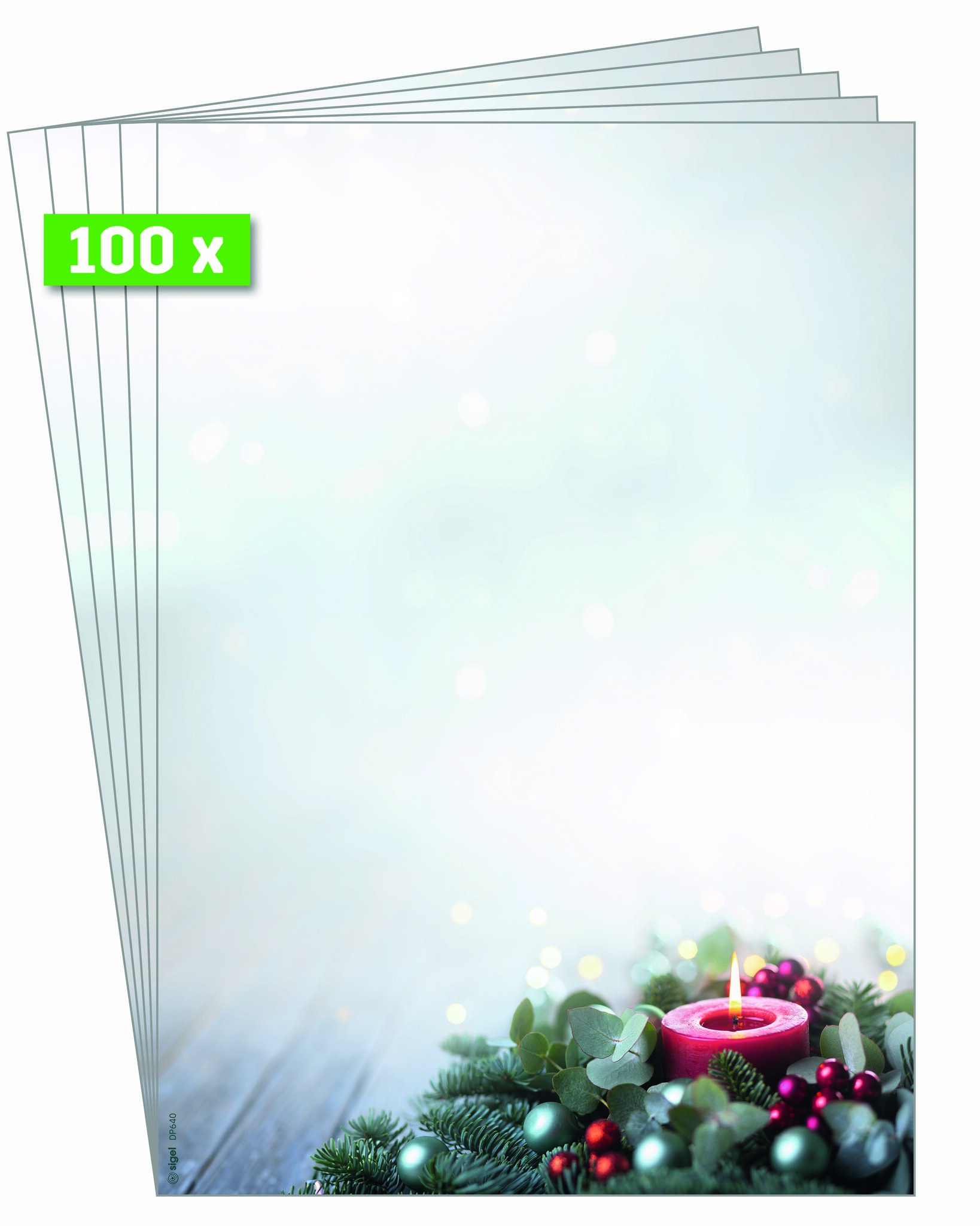 Für besondere Weihnachtsgrüße, die Sie individuell bedrucken und beschriften können. Mit einmaligem Design und ruck-zuck bedruckt: Weihnachts-Motiv-Papier "Candlelight Cheer" (Motiv: Kerze in grün/rot) im Format A4 (Feinpapier, 90 g/m², 100 Blatt). Ihre Produktvorteile:Made in GermanyStimmungsvolles Design, ansprechend und modernFSC-zertifiziert: hochwertiges, umweltfreundliches Papier aus verantwortungsvollen QuellenFür alle Inkjet-, Laser-Drucker und Kopierer geeignet, einfach zu gestalten mit der SIGEL Wordvorlage (Download auf Hersteller-Website) oder per Hand beschriftbarWeihnachtsbriefpapier für Ihre Weihnachtspost, als weihnachtliches Angebotsschild, Einladung, Weihnachtsmenü, Menü- oder SpeisekarteÜberraschen Sie Geschäftspartner, Mitarbeiter, Kollegen oder auch Freunde und Familie mit exklusiven Grüßen zur Weihnachtszeit. Individuell und unkompliziert bedruckbar - für Ihre persönliche und einzigartige Weihnachtspost im Handumdrehen. Keine Abhängigkeit von Druckereien, geringe Auflagen ganz nach Bedarf - und das in Premiumqualität. Lieferumfang: 1x Weihnachts-Motiv-Papier DP640, 100 Blatt