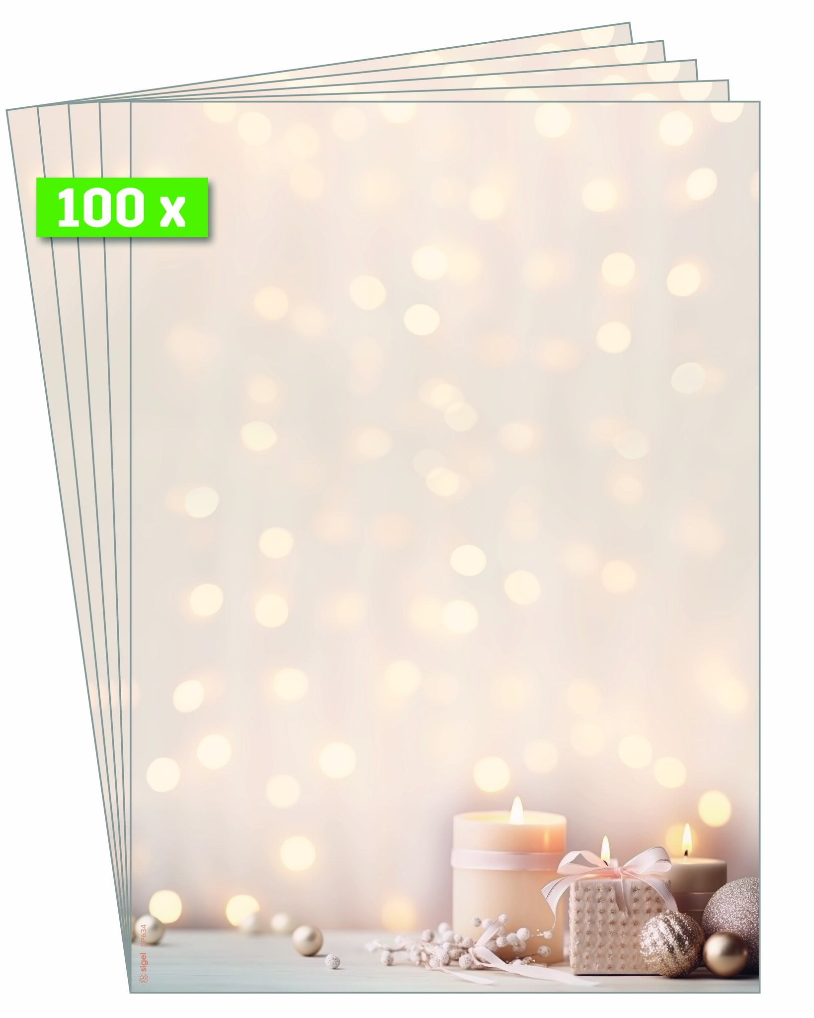 Für besondere Weihnachtsgrüße, die Sie individuell bedrucken und beschriften können. Mit einmaligem Design und ruck-zuck bedruckt: Weihnachts-Motiv-Papier "Golden Glow" (Motiv: Kerzen in beige/chamois/creme/gold) im Format A4 (Feinpapier, 90 g/m², 100 Blatt). Ihre Produktvorteile:Made in GermanyStimmungsvolles Design, ansprechend und modernFSC-zertifiziert: hochwertiges, umweltfreundliches Papier aus verantwortungsvollen QuellenFür alle Inkjet-, Laser-Drucker und Kopierer geeignet, einfach zu gestalten mit der SIGEL Wordvorlage (Download auf Hersteller-Website) oder per Hand beschriftbarWeihnachtsbriefpapier für Ihre Weihnachtspost, als weihnachtliches Angebotsschild, Einladung, Weihnachtsmenü, Menü- oder SpeisekarteÜberraschen Sie Geschäftspartner, Mitarbeiter, Kollegen oder auch Freunde und Familie mit exklusiven Grüßen zur Weihnachtszeit. Individuell und unkompliziert bedruckbar - für Ihre persönliche und einzigartige Weihnachtspost im Handumdrehen. Keine Abhängigkeit von Druckereien, geringe Auflagen ganz nach Bedarf - und das in Premiumqualität. Lieferumfang: 1x Weihnachts-Motiv-Papier DP634, 100 Blatt