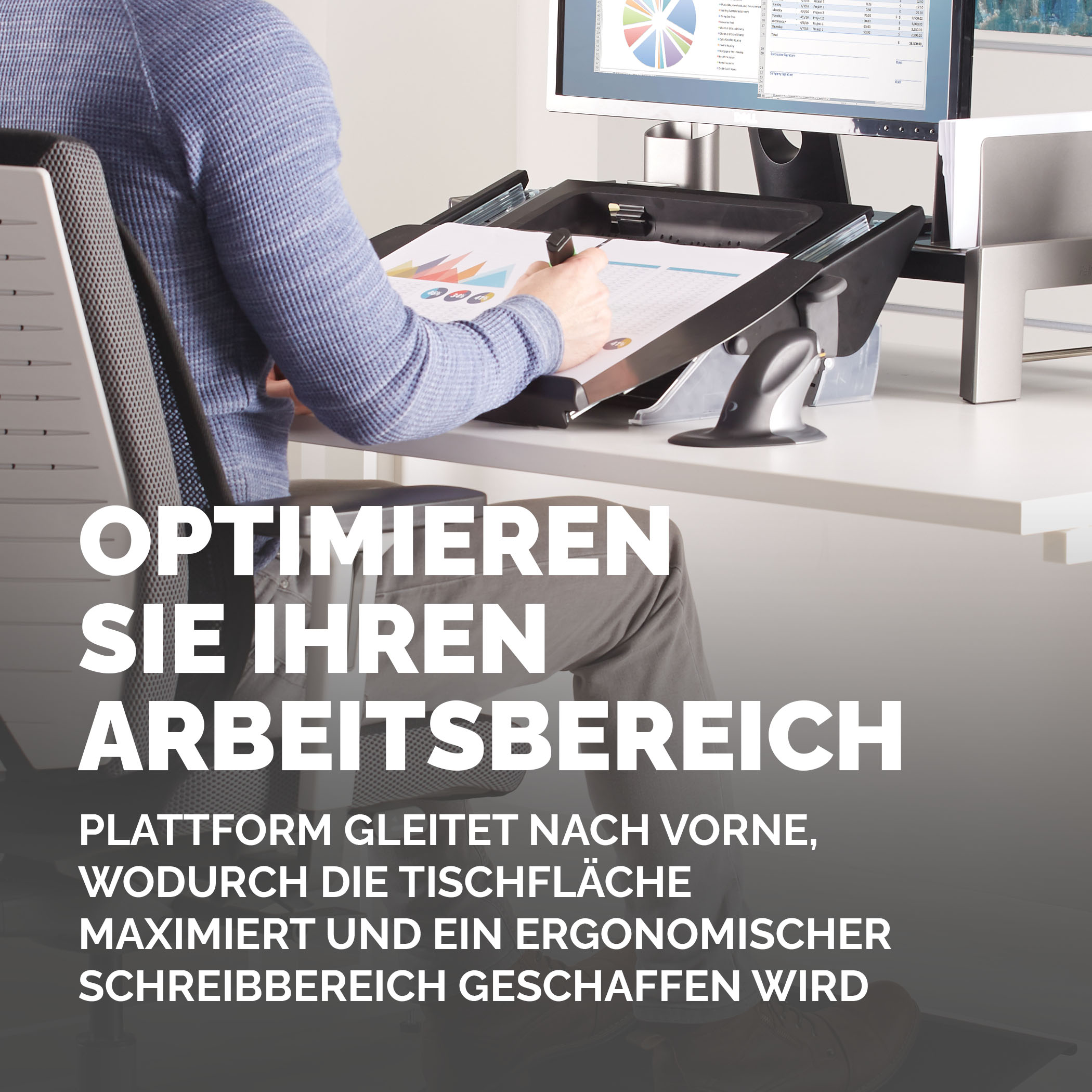Zur Nutzung zwischen Monitor/Laptop und Tastatur. Plattform gleitet stufenlos nach vorne zur Abdeckung der Tastatur und Schaffung einer ergonomischen Schreibunterlage. Mit herausnehmbarem Zubehörfach.