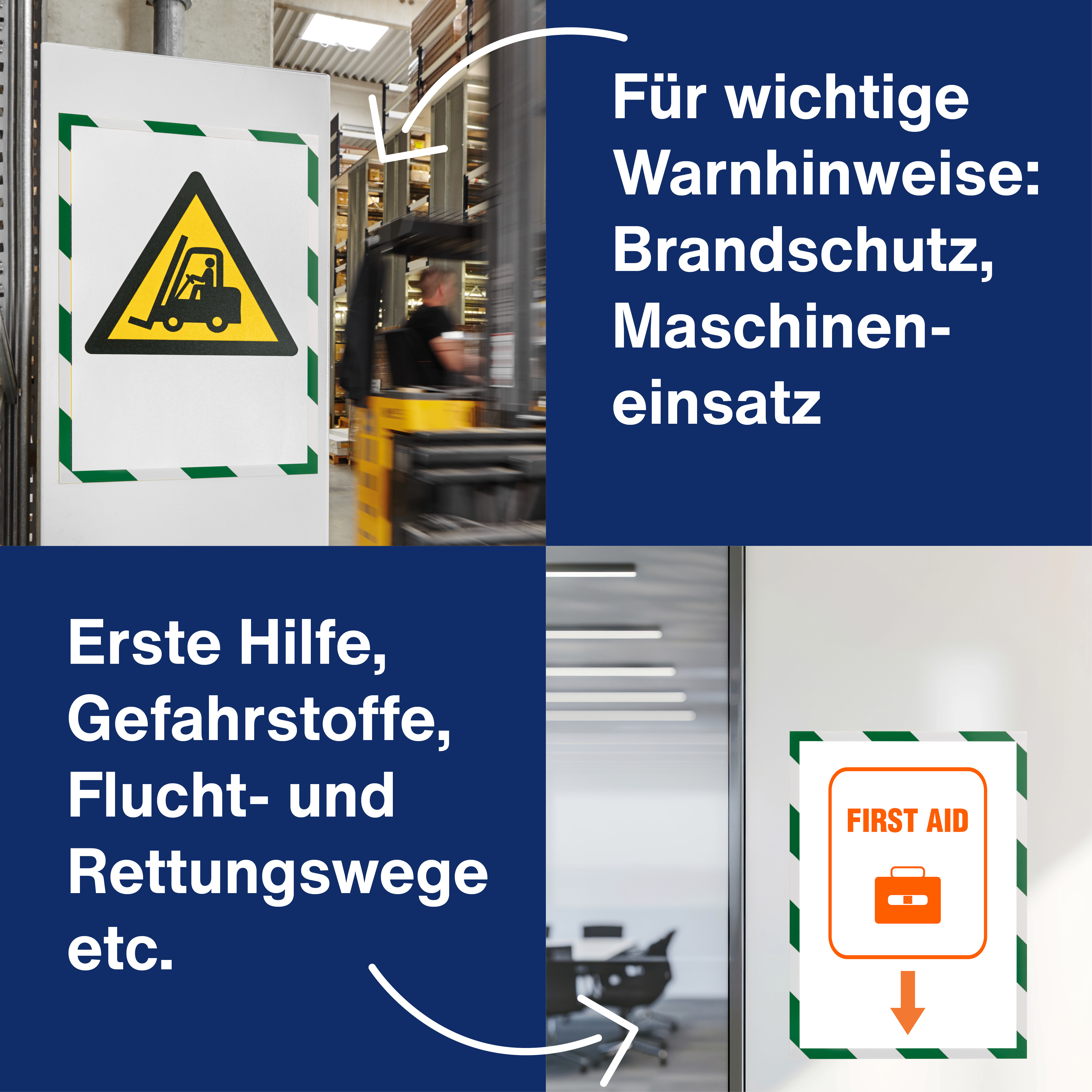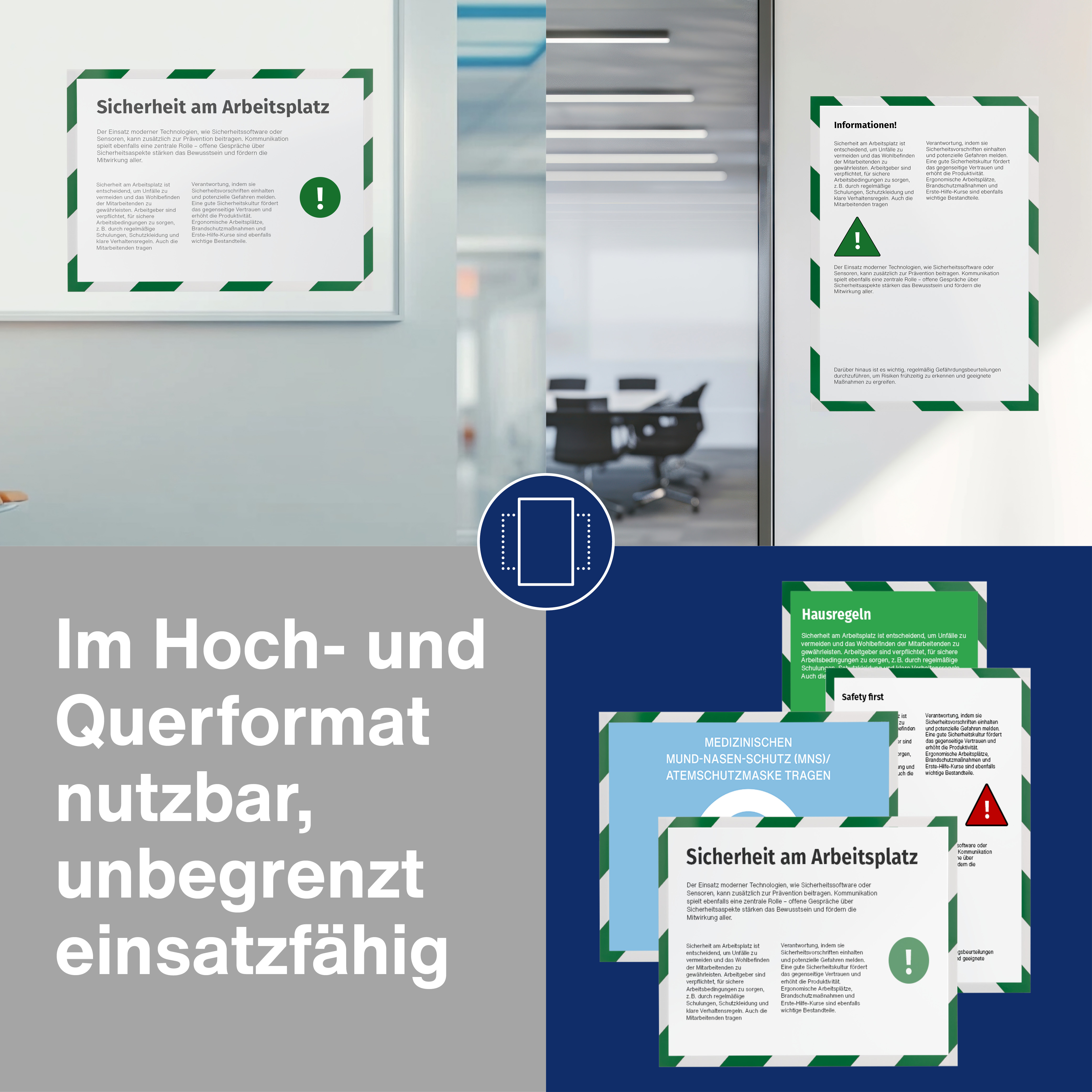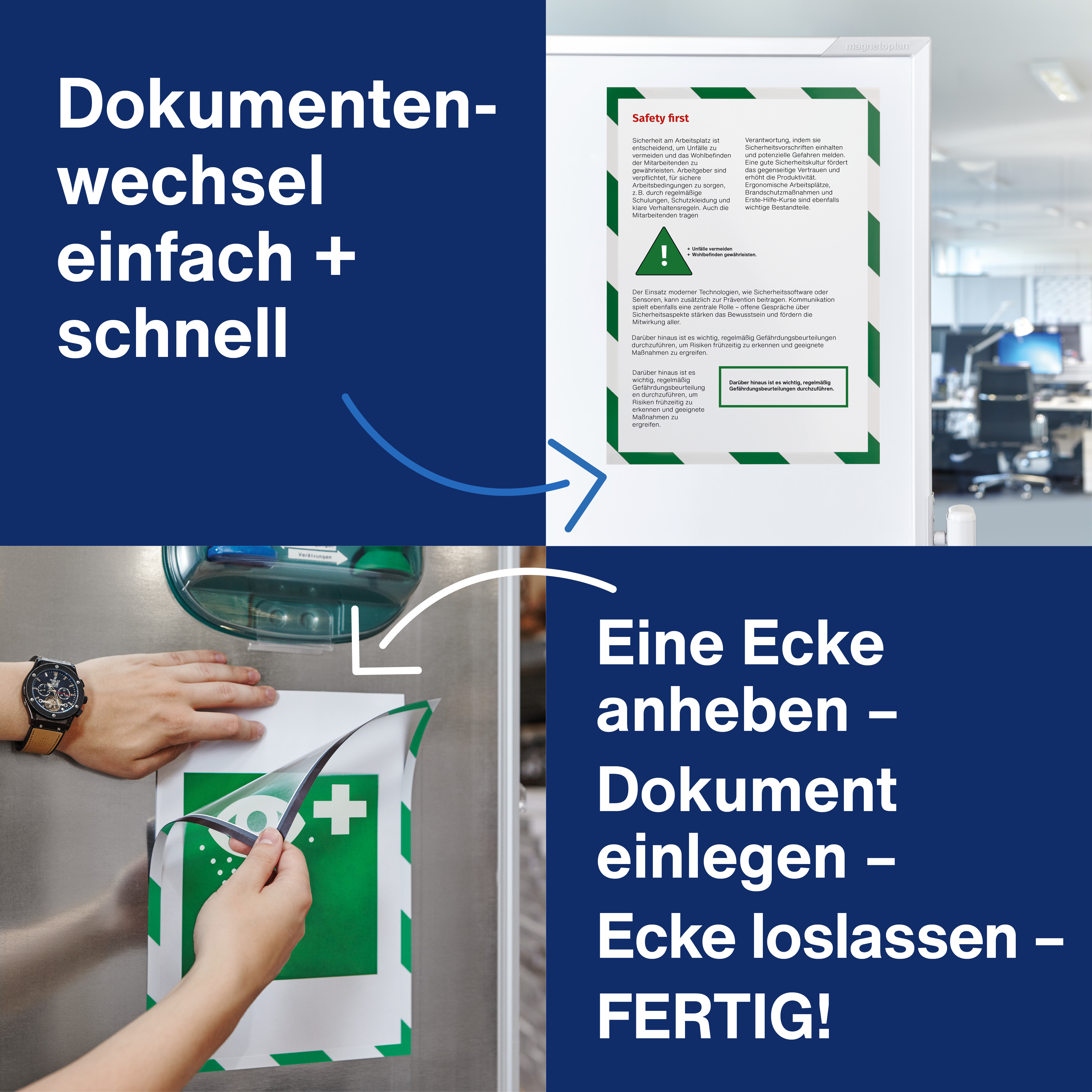 Zum schnellen + einfachen Einlegen von Warnhinweisen für Brandschutz und Maschineneinsatz, Erste Hilfe, Gefahrstoffe, Flucht- und Rettungswege etc. Magnethaftend auf allen eisenhaltigen Oberflächen wie Whiteboards, Maschinen, Metallschränken und -türen. Im Hoch- und Querformat einsetzbar. Dokumentenwechsel ruckzuck möglich: Eine Ecke anheben - Dokument wechseln - Ecke loslassen - fertig!