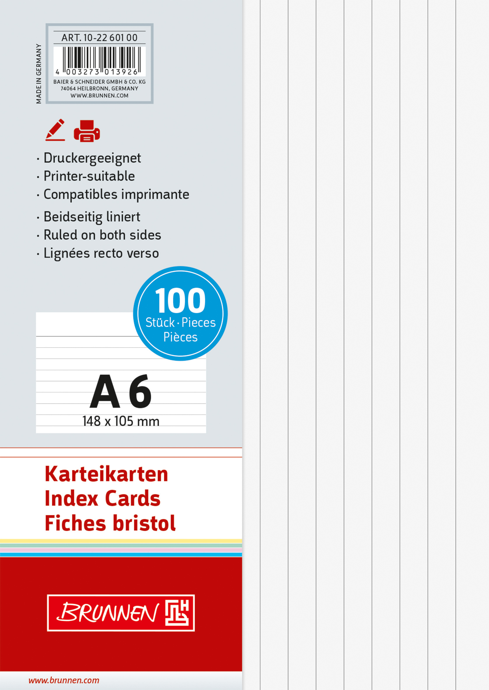 Produktbeschreibung Karteikarten BRUNNEN 22601 A6 liniert weiß 100 Stück