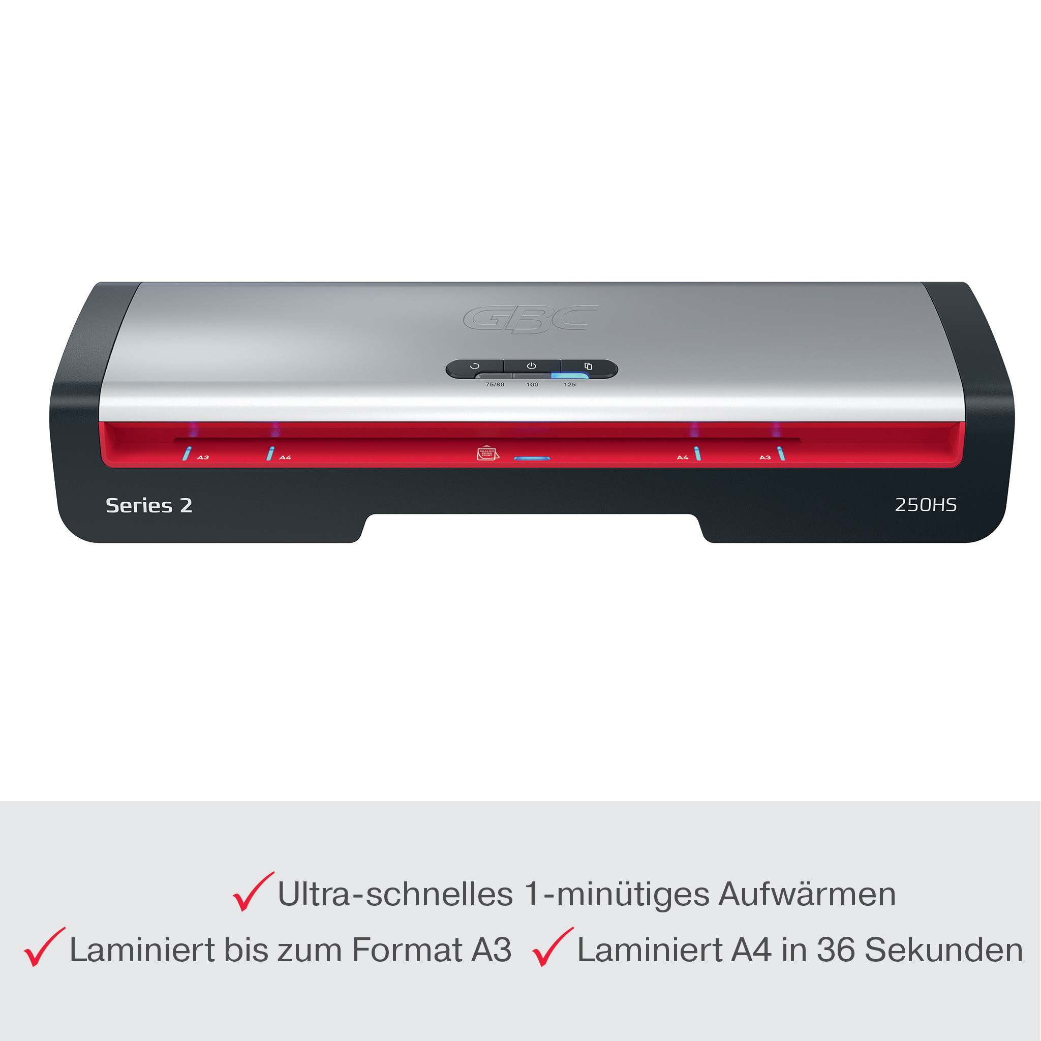 GBC 250HS Büro A3-Laminiergerät bis 125 Mikron, 1 Minute Aufwärmzeit, 500mm/Min · Das GBC 250HS A3-Laminiergerät ist eine zuverlässige und effiziente Lösung für den täglichen Laminierbedarf im Büro. Dieses Hochgeschwindigkeits-Laminiergerät wurde für professionelle Umgebungen entwickelt und verbindet Leistung mit Benutzerfreundlichkeit. Steigern Sie Ihre Produktivität und reduzieren Sie die Laminierzeit um 33 % mit GBC-Hochgeschwindigkeitsfolien. Mit einer schnellen Aufwärmzeit von 1 Minute laminiert es ein 75-Micron-A4-Blatt in nur 36 Sekunden und ist damit ideal für schnelle Büroarbeiten. Das intuitive Bedienfeld bietet drei Einstellungen für die Foliendicke von 75 bis 125 Mikron und damit Flexibilität für verschiedene Dokumententypen. Das Bedienfeld verfügt außerdem über eine Rücklaufsperrtaste, mit der sich falsch eingezogenen Folien problemlos entfernen lassen. Darüber hinaus bietet das SMART-Status-LED-System klare visuelle und akustische Hinweise: rot während des Aufwärmens, blau mit einem Ton, wenn das Gerät bereit ist, und eine automatische Abschaltung nach 15 Minuten Inaktivität, um Energie zu sparen. Die SMART-Eingangsführungs-LEDs sorgen für eine gerade Ausrichtung der Folien, um Staus zu vermeiden, und machen jede Laminierung perfekt. Schützen und bewahren Sie Ihre wichtigen Dokumente mit Schnelligkeit und einer glatten, professionellen Oberfläche. Schwarze und rote Farbe. · Schützen Sie Ihre wichtigen Dokumente mit dem GBC 250HS Hochgeschwindigkeits-A3-Büro-Laminiergerät. Mit einer schnellen Aufwärmzeit von 1 Minute und der Fähigkeit, ein A4-Blatt mit einer Stärke von 75 Mikron in nur 36 Sekunden zu laminieren, gewährleistet es effiziente, hochwertige Ergebnisse für alle Ihre professionellen Laminieranforderungen. · Schnelle Aufwärmzeit, einsatzbereit in nur 1 Minute. · Kompatibel mit Folien von 75 bis 125 Mikrometern. Laminiert ID-Karten bis hin zu Dokumenten im Format A3. · GBC High-Speed-Laminatoren reduzieren die Laminierzeit um 33 %, wenn GBC-Hochgeschwindigkeitsfolien verwendet werden. · Laminiert ein A4-Dokument (75 mic) in nur 36 Sekunden. · Laminiert 16 x A4 in 10 Minuten. · SMART-Status-LED: leuchtet während der Aufwärmphase rot und wird blau mit einem akustischen Signal, wenn das Laminiergerät betriebsbereit ist. · SMART-Eingangsführungs-LEDs: stellen sicher, dass die Folien gerade durch das Laminiergerät geführt werden, um Staus zu vermeiden. · Das Bedienfeld verfügt über eine Rücklaufschutztaste, mit der sich falsch eingezogene Folien leicht entfernen lassen. · Enthält ein Starterpaket mit 5x A4-Folien (75 Mikron). · Sparen Sie Energie mit der 15-minütigen Abschaltautomatik, die sich bei Inaktivität einschaltet. · Niedriger Geräuschpegel <50Dba für weniger Ablenkung. · Für beste Ergebnisse mit Original GBC-Folien verwenden: z.B. A4 Laminiertasche 2 x 75 Mikron, 100 Stück (Art. Nr. 3740400). CE-zertifiziert, TUV/GS.