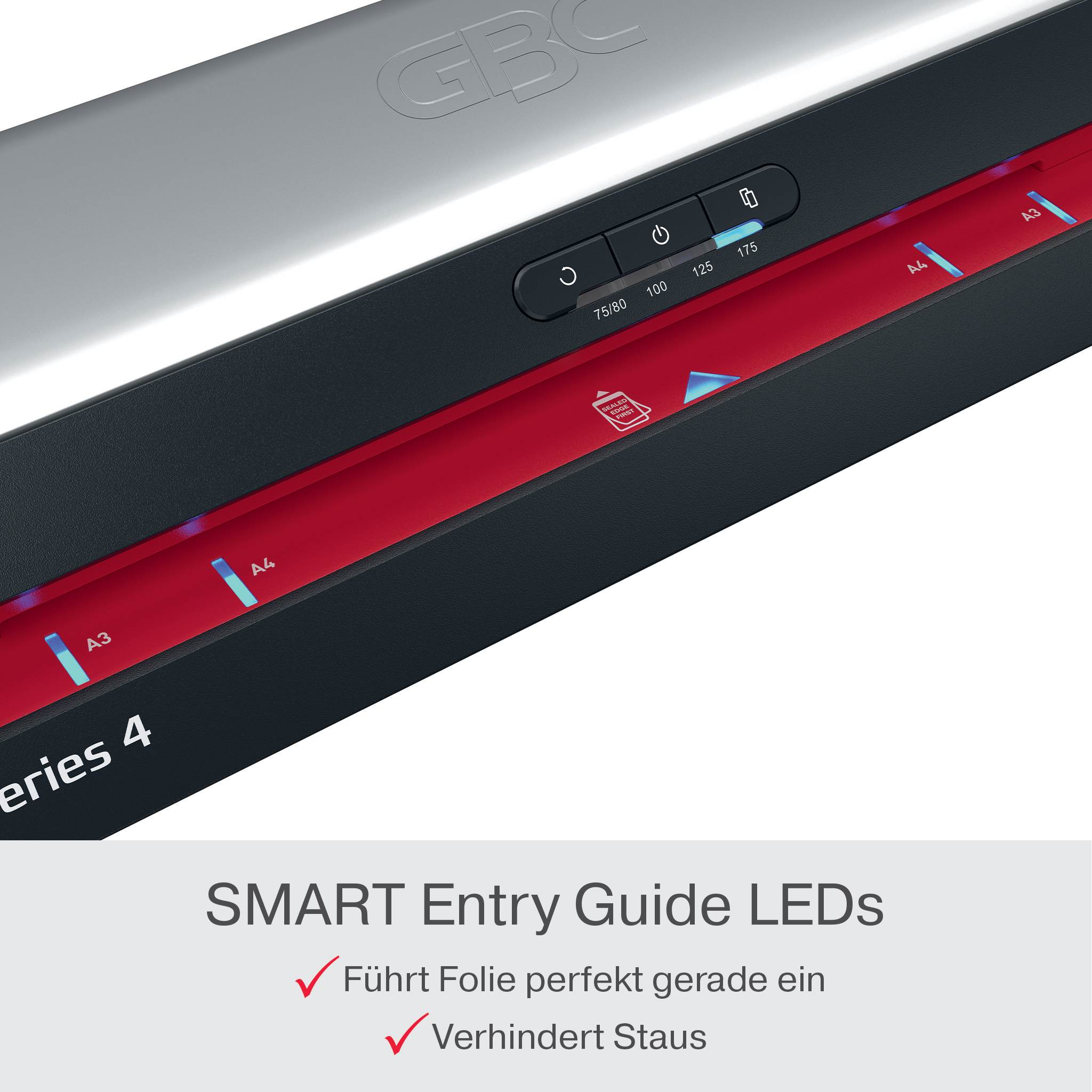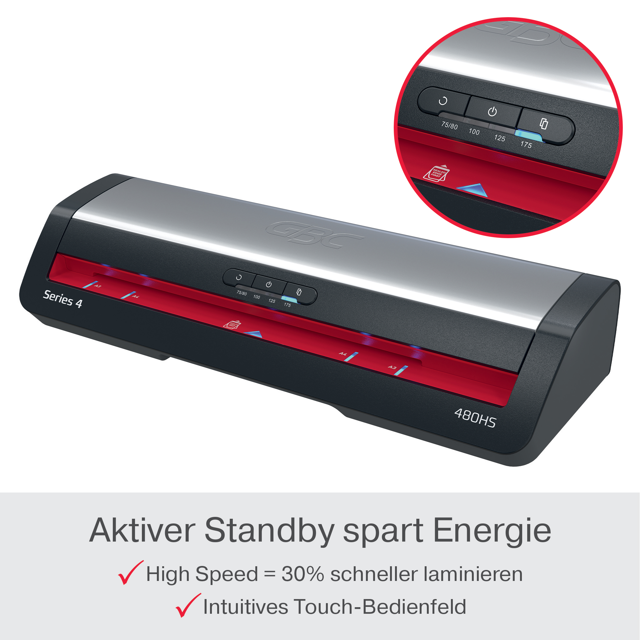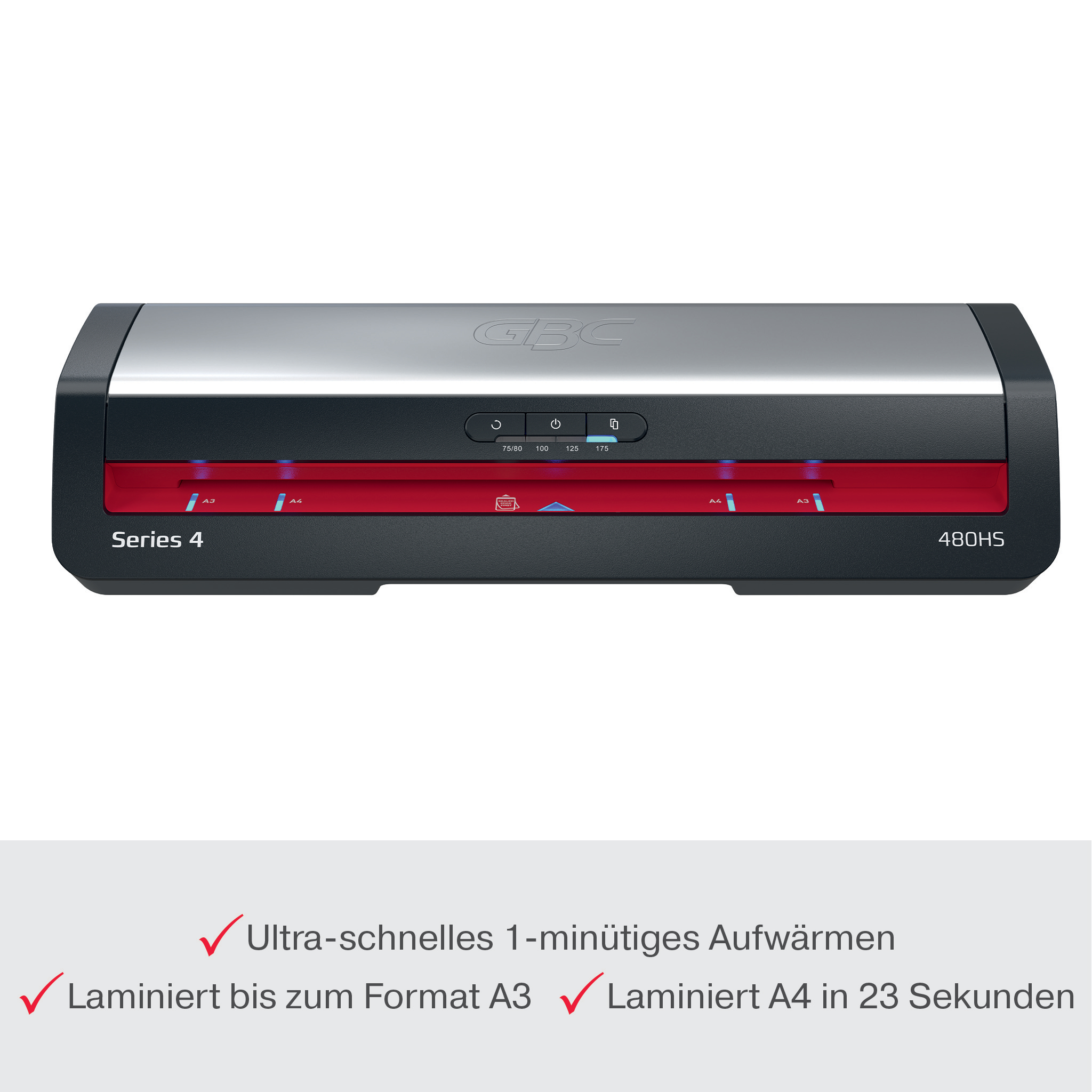 GBC 480HS Büro A3-Laminiergerät bis 175 Mikron, 1 Minute Aufwärmzeit, 800mm/Min · Das GBC 480HS A3-Laminiergerät ist eine zuverlässige und effiziente Lösung für den Laminierbedarf in großen Mengen. Dieses Hochgeschwindigkeits-Laminiergerät wurde für professionelle Umgebungen entwickelt und verbindet Leistung mit Benutzerfreundlichkeit. Steigern Sie Ihre Produktivität und reduzieren Sie die Laminierzeit um 33 % mit GBC-Hochgeschwindigkeitsfolien. Mit einer schnellen Aufwärmzeit von 1 Minute laminiert er ein 75-Micron-A4-Blatt in nur 23 Sekunden und ist damit ideal für schnelle Büroarbeiten. Das intuitive Bedienfeld bietet vier Einstellungen für die Foliendicke von 75 bis 175 Mikron und damit Flexibilität für verschiedene Dokumententypen. Das Bedienfeld verfügt außerdem über eine manuelle Rücklauftaste und eine automatische Rücklauffunktion mit aktiver Stauerkennung für eine nahtlose Entnahme von Folien. Darüber hinaus bietet das SMART-Status-LED-System klare visuelle und akustische Hinweise: rot während des Aufwärmens, blau mit einem Ton, wenn das Gerät bereit ist, und eine automatische Abschaltung nach 15 Minuten Inaktivität, um Energie zu sparen. Die SMART-Eingangsführungs-LEDs sorgen für eine gerade Ausrichtung des Foliens, um Staus zu vermeiden, und machen jede Laminierung perfekt. Schützen und bewahren Sie Ihre wichtigen Dokumente mit Schnelligkeit und einer glatten, professionellen Oberfläche. Schwarze und rote Farbe. · Das Hochgeschwindigkeits-A3-Laminiergerät GBC 480HS bietet schnellen und zuverlässigen Dokumentenschutz und ist für vielbeschäftigte Büroumgebungen konzipiert. Mit einer schnellen Aufwärmzeit von 1 Minute und der Fähigkeit, ein A4-Blatt mit einer Stärke von 75 Mikron in nur 23 Sekunden zu laminieren, gewährleistet es effiziente, hochwertige Ergebnisse für alle Ihre professionellen Laminieranforderungen. · Schnelle Aufwärmzeit, einsatzbereit in nur 1 Minute. · Kompatibel mit Folien von 75 bis 175 Mikrometern. Laminiert ID-Karten bis hin zu Dokumenten im Format A3. · GBC High-Speed-Laminatoren reduzieren die Laminierzeit um 33 %, wenn GBC-Hochgeschwindigkeitsfolien verwendet werden. · Laminiert ein A4-Dokument (75 mic) in nur 23 Sekunden. Laminiert 26 x A4 in 10 Minuten. · SMART-Status-LED: leuchtet während der Aufwärmphase rot und wird blau mit einem akustischen Signal, wenn das Laminiergerät betriebsbereit ist. · SMART-Eingangsführungs-LEDs: stellen sicher, dass die Folien gerade durch das Laminiergerät geführt werden, um Staus zu vermeiden. · Automatische Rücklauffunktion erkennt ein Problem und fährt die Folie automatisch aus dem Gerät zurück. · Das Bedienfeld verfügt über eine Rücklaufschutztaste, mit der sich falsch eingezogene Folien leicht entfernen lassen. · Enthält ein Starterpaket mit 5x A4-Folien (75 Mikron). · Sparen Sie Energie mit der 15-minütigen Abschaltautomatik, die sich bei Inaktivität einschaltet. · Niedriger Geräuschpegel <50Dba für weniger Ablenkung. · Für beste Ergebnisse mit Original GBC-Folien verwenden: z.B. A4 Laminiertasche 2 x 75 Mikron, 100 Stück (Art. Nr. 3740400). CE-zertifiziert, TUV/GS.