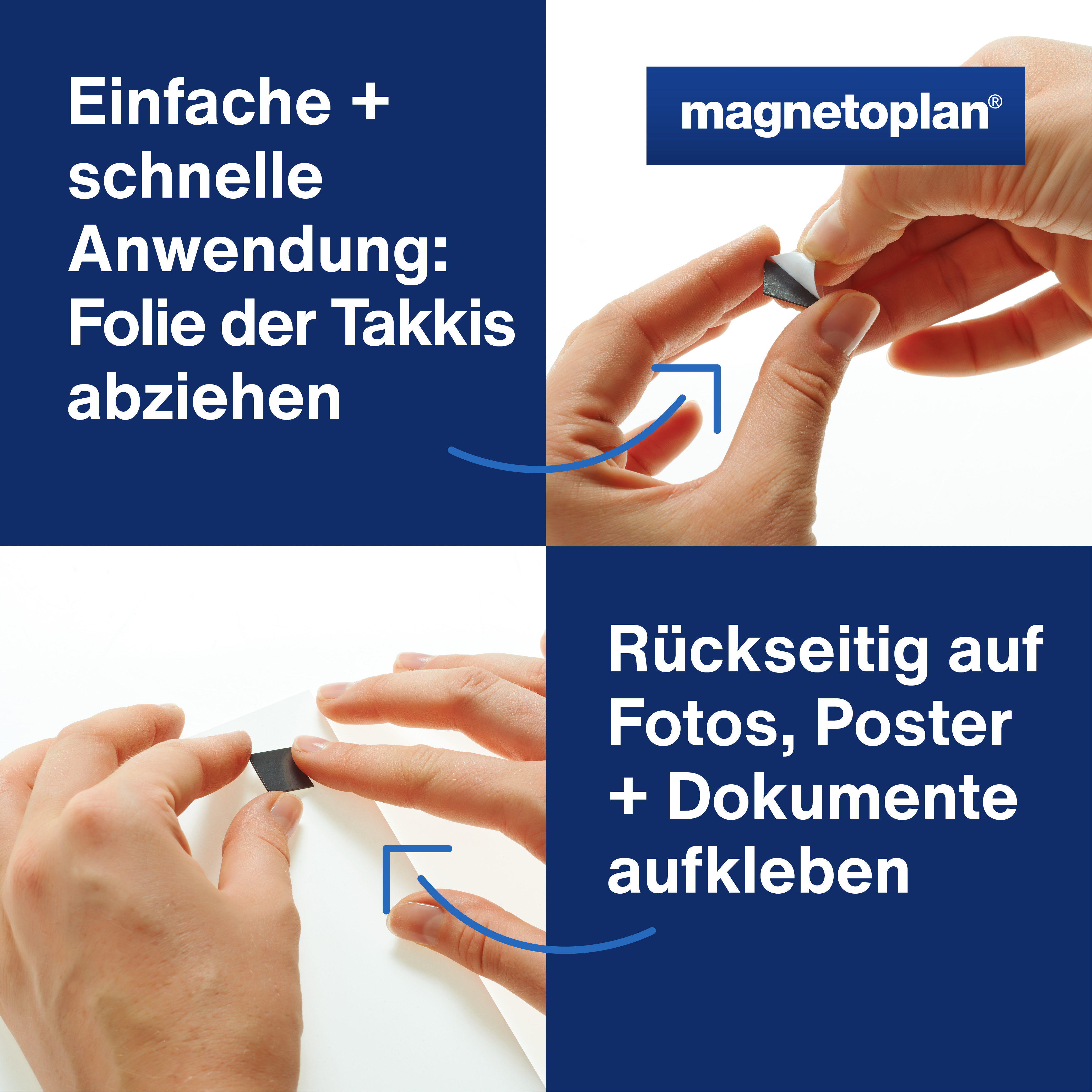 Takkis, zur sauberen, unsichtbaren, rückseitigen Befestigung von Postern, Fotos, Notizen etc., an allen metallhaltigen Oberflächen. Für Messebau, Schule, Büro oder im Privatbereich, flexibel einsetzbar. Die magnethaftenden Plättchen lassen sich beliebig entnehmen und rückseitig auf Papier oder Karton aufkleben, schon halten z.B. Memos, Poster oder Fotos unsichtbar auf allen metallhaltigen Oberflächen. Kein Magnet im Sichtfeld - die Information im Vordergrund.