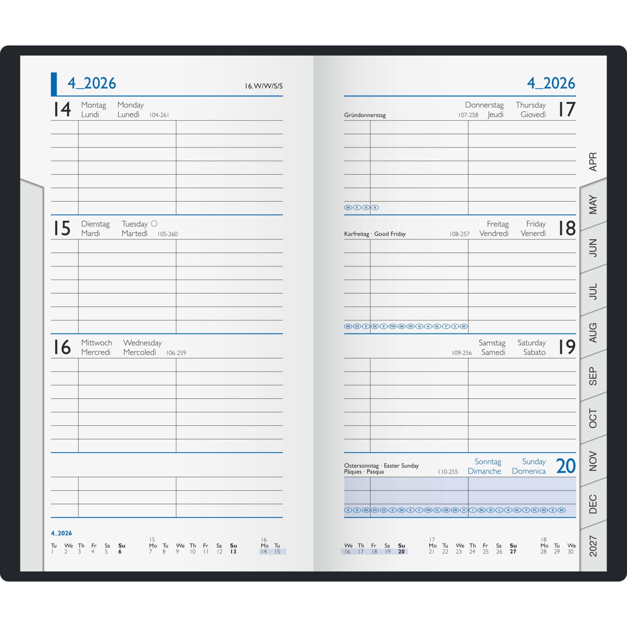 Kalenderaufteilung: | 1 Woche/2 Seiten |