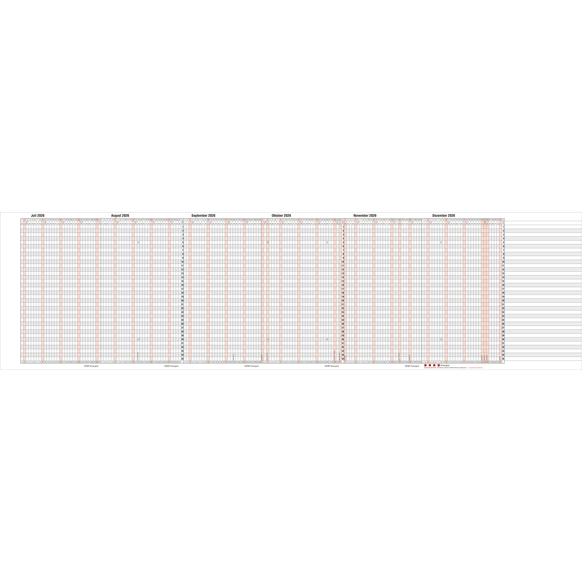 Leporellogefalzt. Von Januar bis Dezember. Zählung 1 bis 35 alle 2 Monate. Namenszeilen abwechselnd gerastert. Sonn- und Feiertage in Rotdruck.