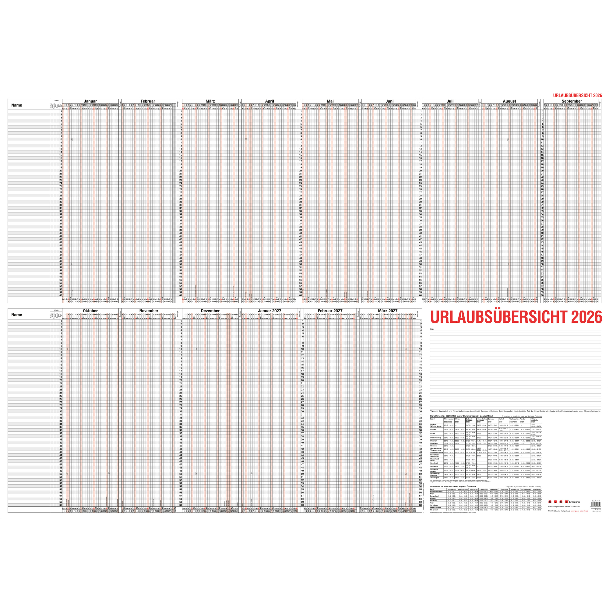 Namenszeilen abwechselnd gerastert. Januar bis März des Folgejahres. Sonn- und Feiertage in Rotdruck. Zählung 1 - 60 alle 3 Monate. Zeilenhöhe 6 mm. Mit Schulferienübersicht.